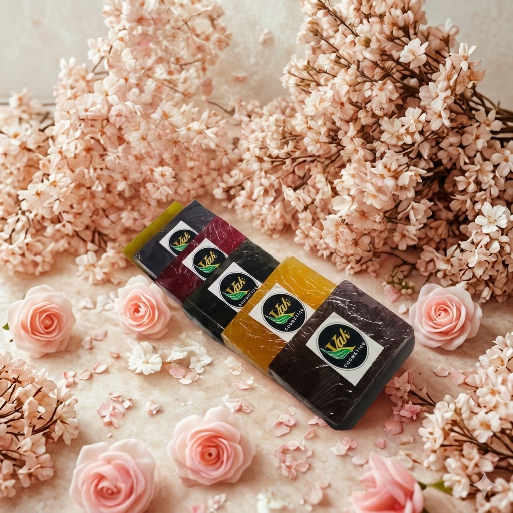 All 5 signature soaps: Coffee, Almond, Zafran, Moringa & Whitening. One of each.